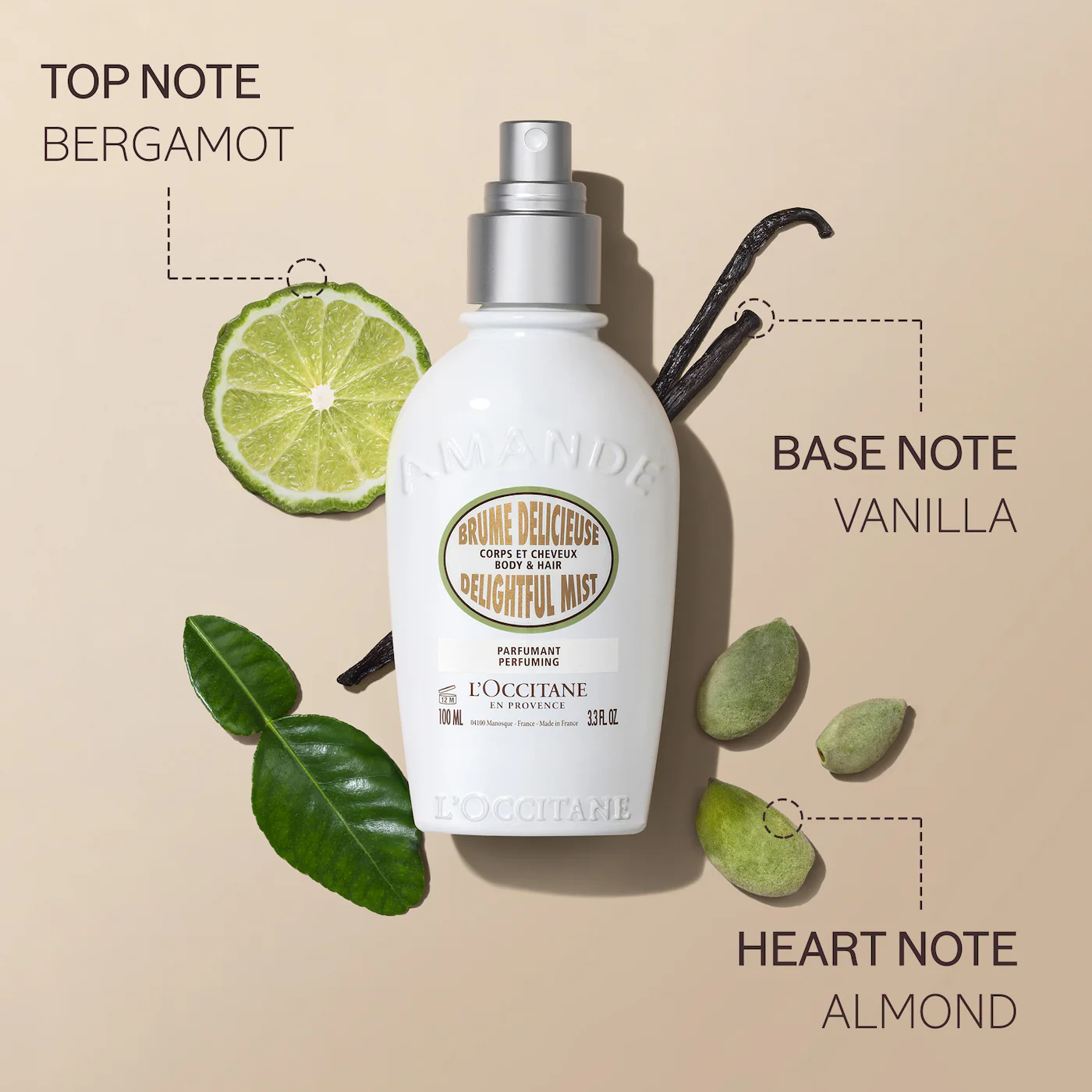 Qué es: Una bruma ligera y no pegajosa para cabello y cuerpo que envuelve los sentidos con un reconfortante aroma gourmand de almendras frescas y vainilla cálida, ideal para refrescarte al instante.