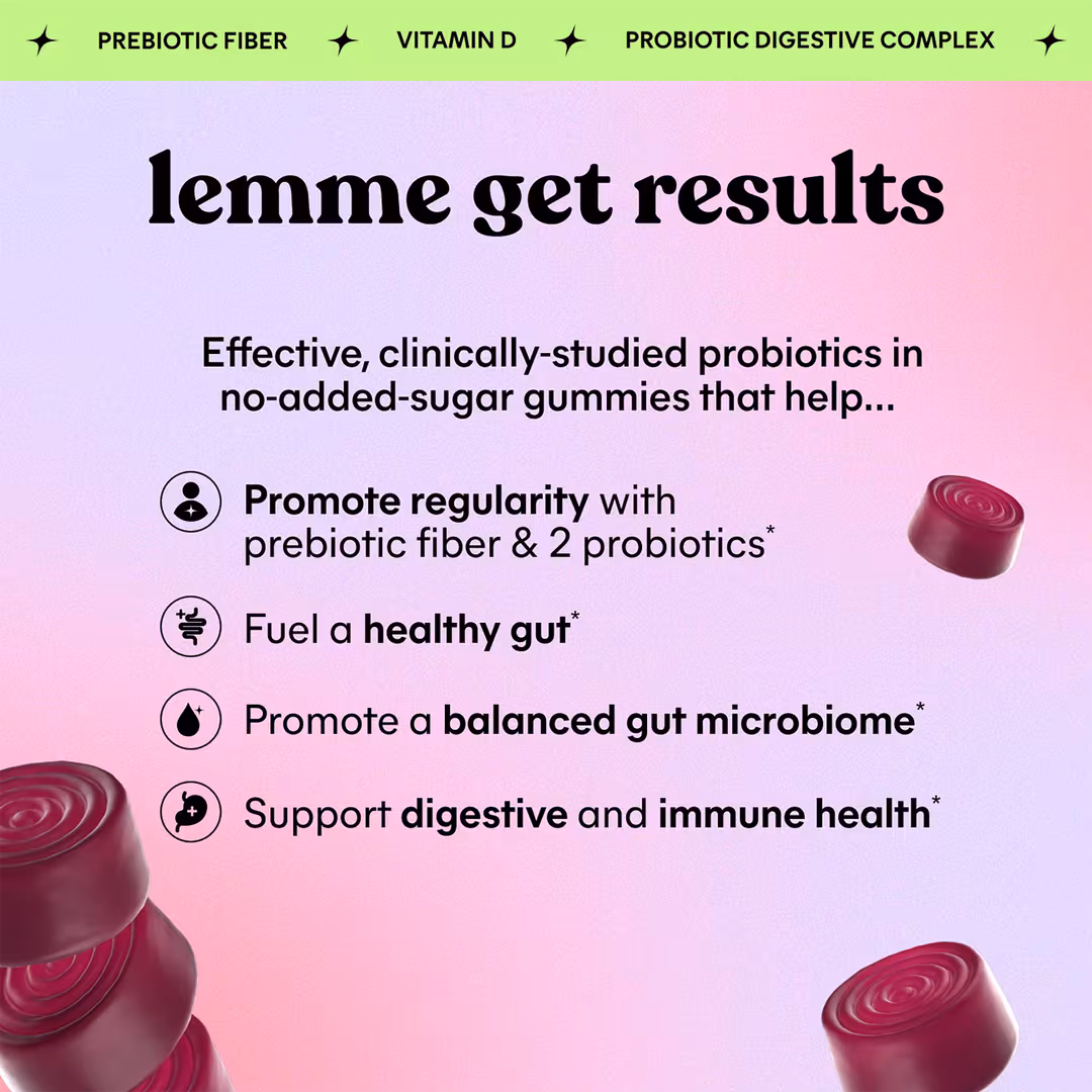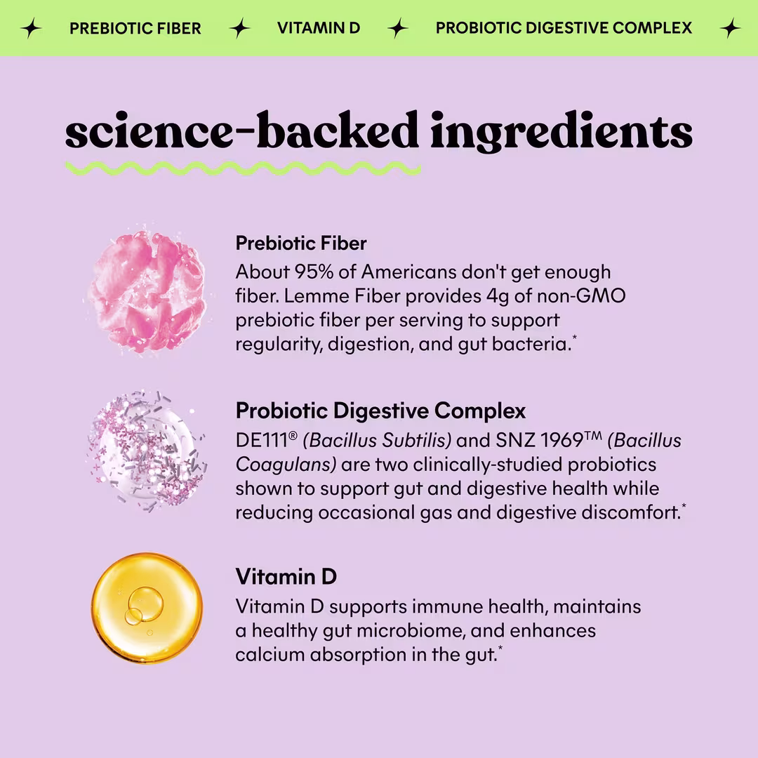 Qué es: Lemme Fiber: Gomitas de Fibra y Probióticos apoyan la regularidad, la salud digestiva y un microbioma intestinal equilibrado gracias a fibra prebiótica sin OGM y 2 probióticos clínicamente estudiados.