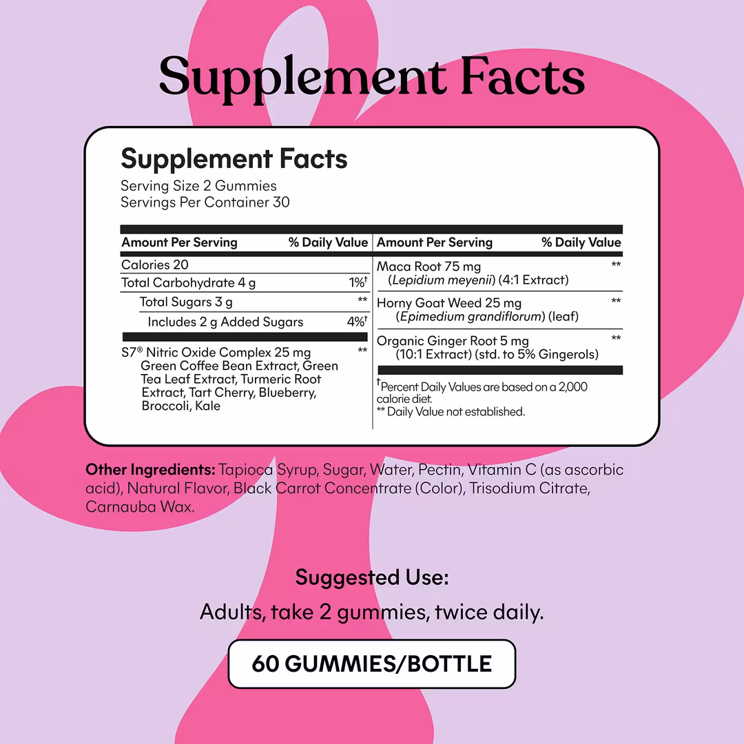 Qué es: Daily Intimacy Gummies, el complejo S7® estudiado clínicamente apoya los niveles de óxido nítrico y promueve el flujo sanguíneo saludable, mientras que Horny Goat Weed y Maca Root encienden su juego.